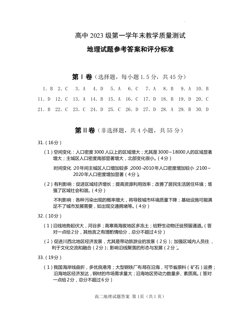 四川省绵阳市2023-2024学年高一下学期期末教学质量测试 地理答案