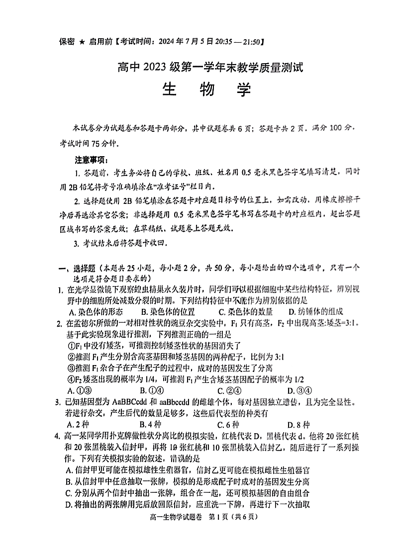 四川省绵阳市2023-2024学年高一下学期期末教学质量测试 生物