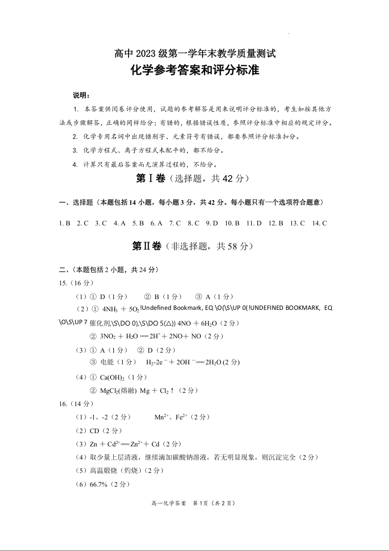 四川省绵阳市2023-2024学年高一下学期期末教学质量测试 化学答案