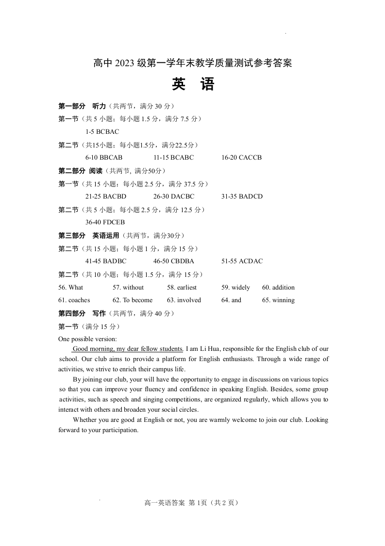 四川省绵阳市2023-2024学年高一下学期期末教学质量测试 英语答案