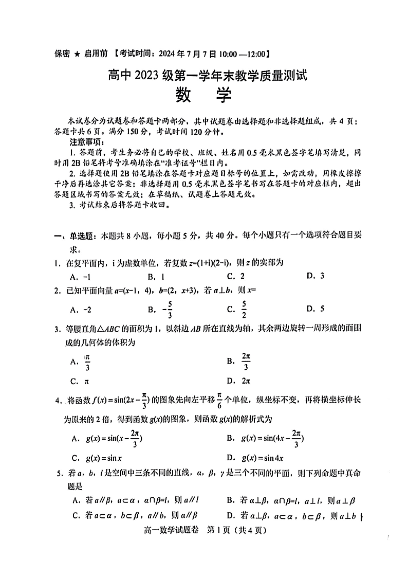 四川省绵阳市2023-2024学年高一下学期期末教学质量测试 数学