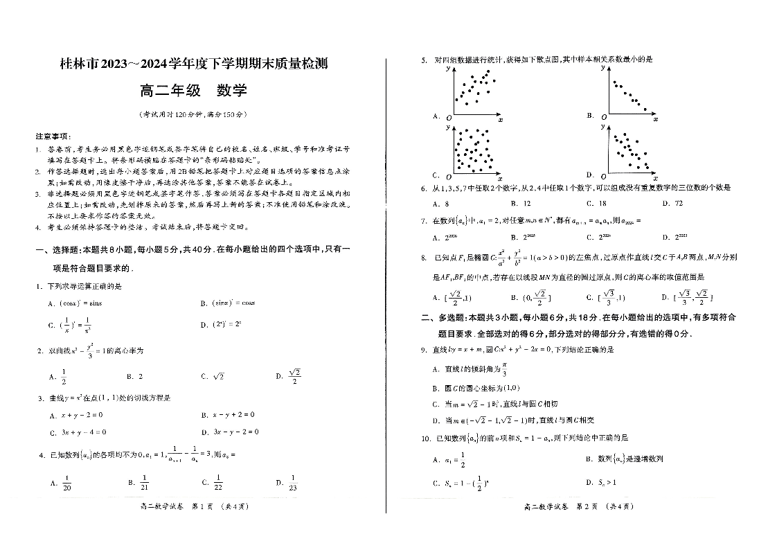 广西桂林市2023-2024学年高二下学期期末质量检测 数学