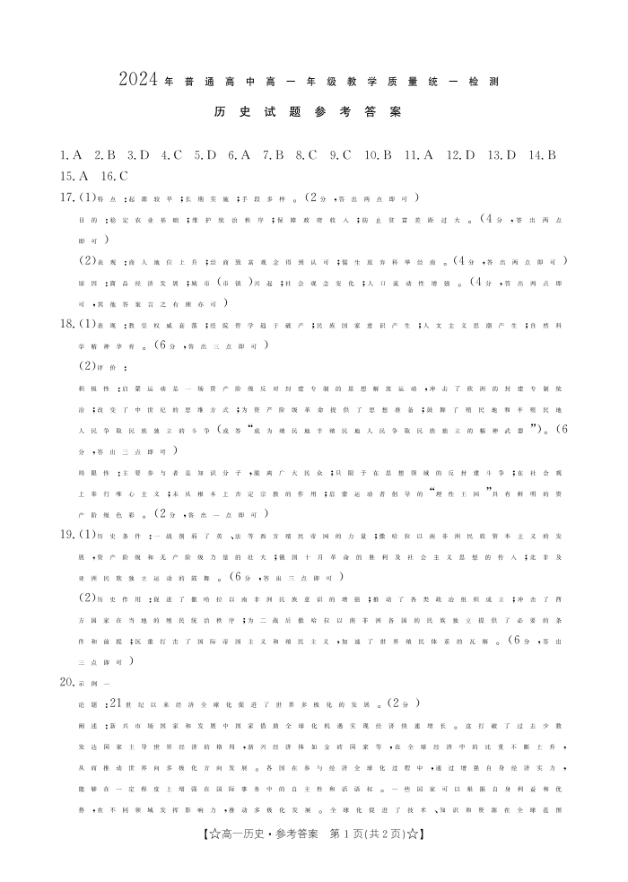 甘肃省普通高中2023-2024学年高一下学期期末教学质量统一检测 历史答案