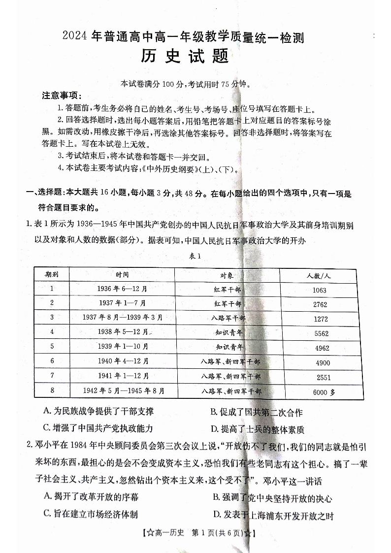 甘肃省普通高中2023-2024学年高一下学期期末教学质量统一检测 历史