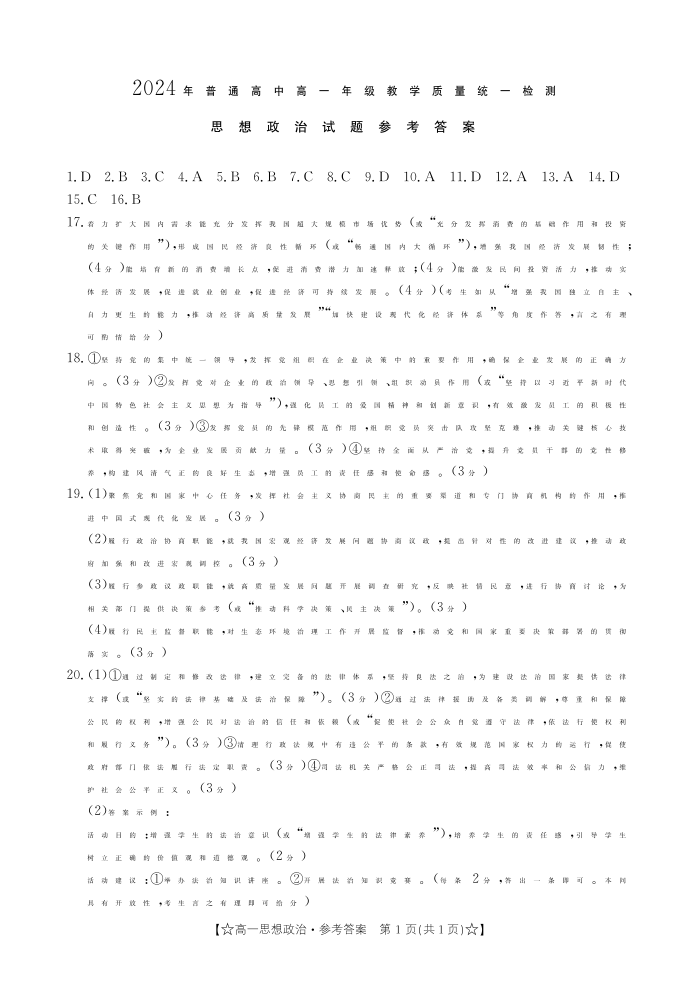 甘肃省普通高中2023-2024学年高一下学期期末教学质量统一检测 政治答案