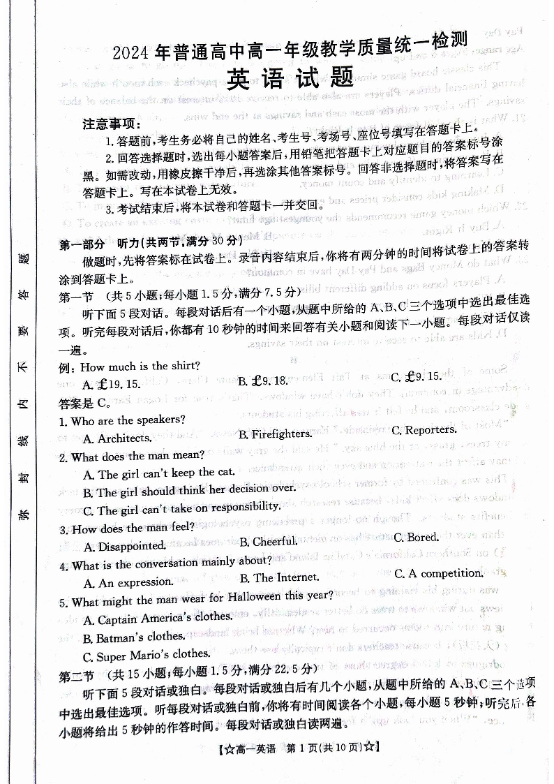 甘肃省普通高中2023-2024学年高一下学期期末教学质量统一检测 英语