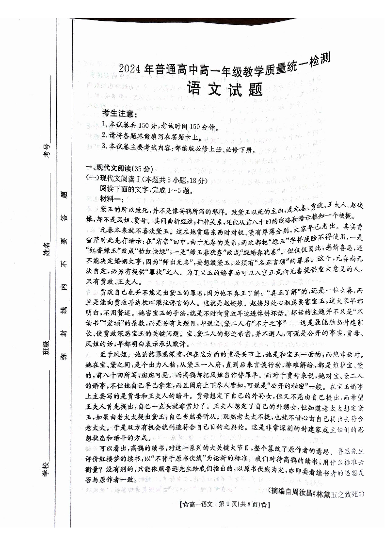 甘肃省普通高中2023-2024学年高一下学期期末教学质量统一检测 语文