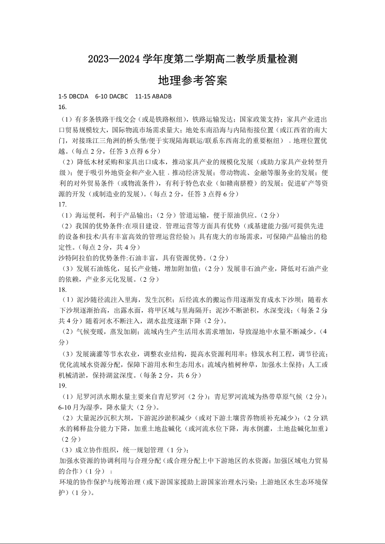 山东省淄博市2023-2024学年度第二学期高二教学质量检测 地理答案