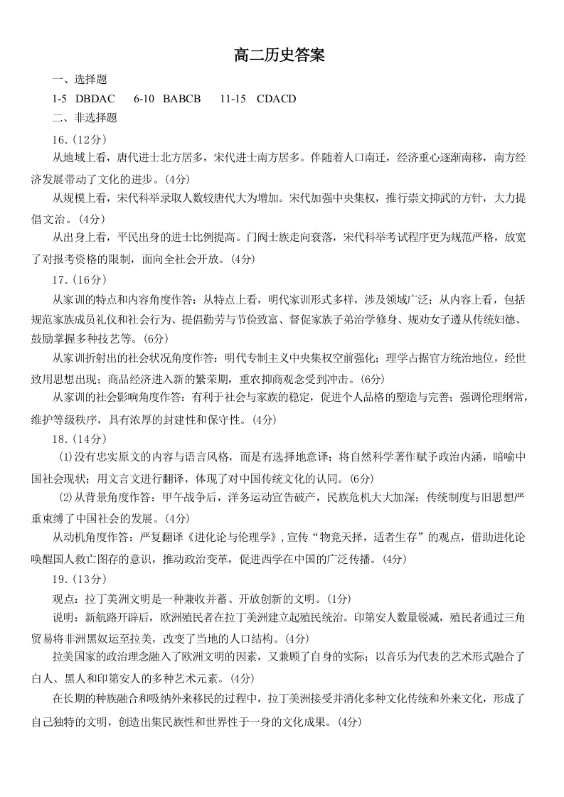 山东省淄博市2023-2024学年度第二学期高二教学质量检测 历史答案