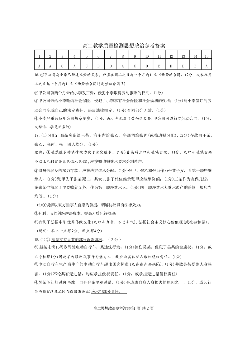 山东省淄博市2023-2024学年度第二学期高二教学质量检测 政治答案