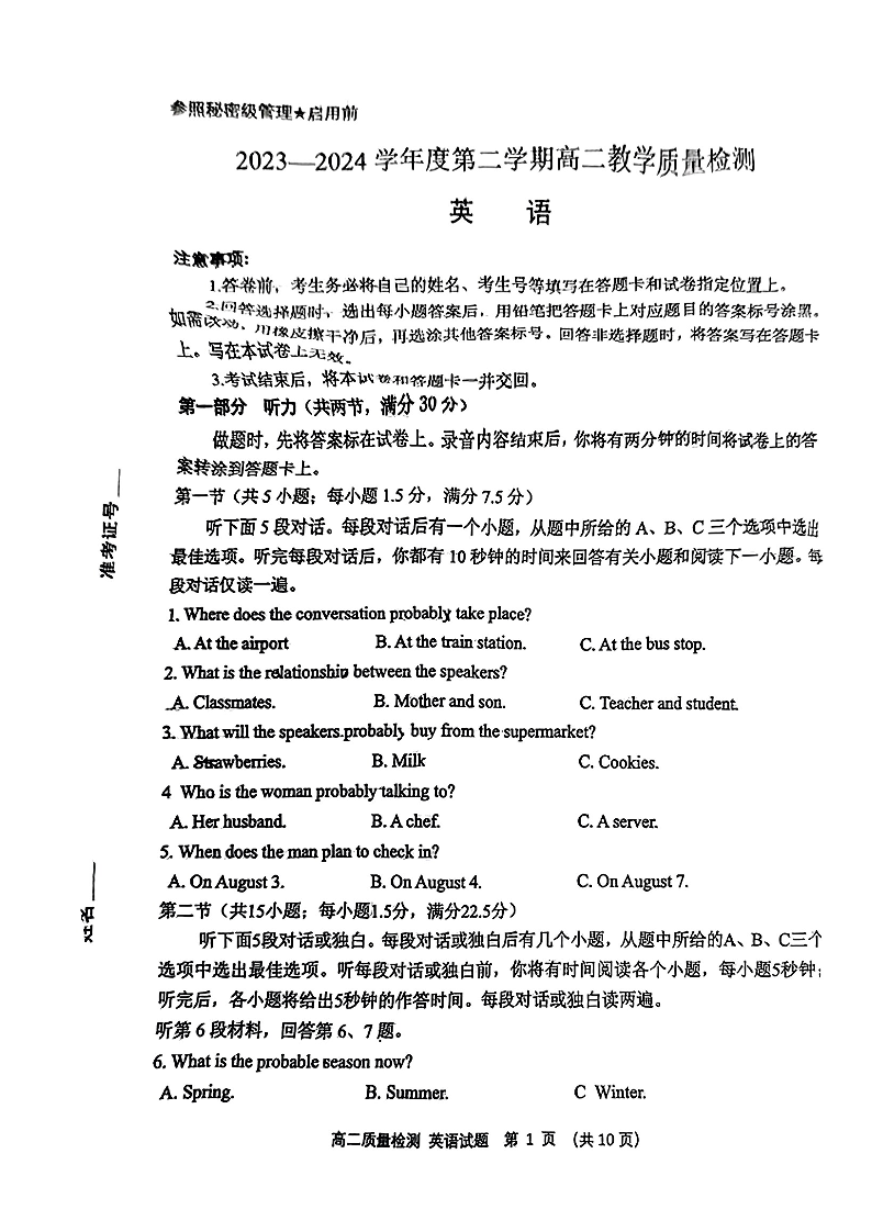山东省淄博市2023-2024学年度第二学期高二教学质量检测 英语