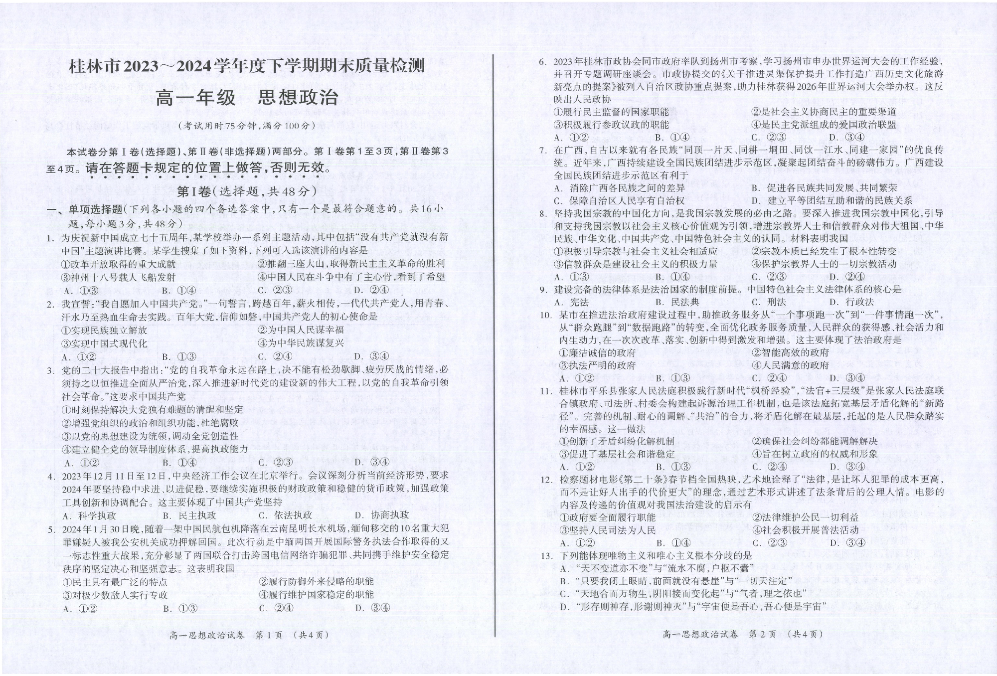 广西桂林市2023-2024学年高一下学期期末质量检测 政治