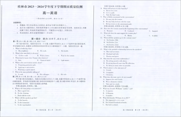 广西桂林市2023-2024学年高一下学期期末质量检测 英语