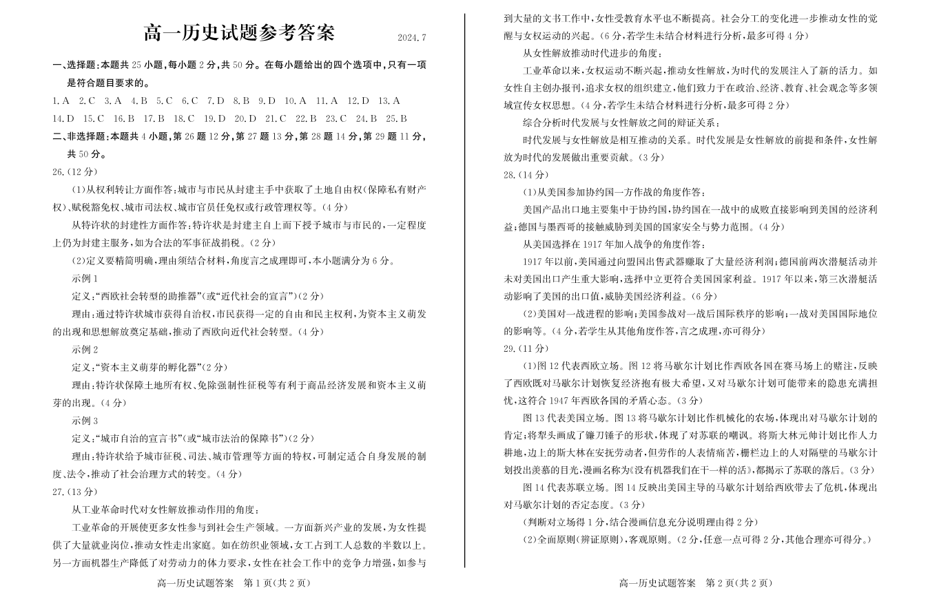 山东省滨州市2023-2024学年高一下学期期末考试 历史答案