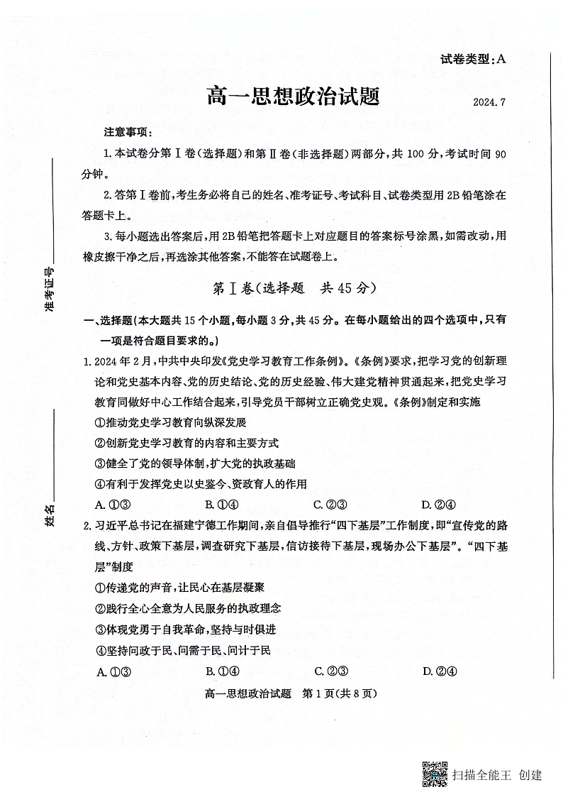 山东省滨州市2023-2024学年高一下学期期末考试 政治