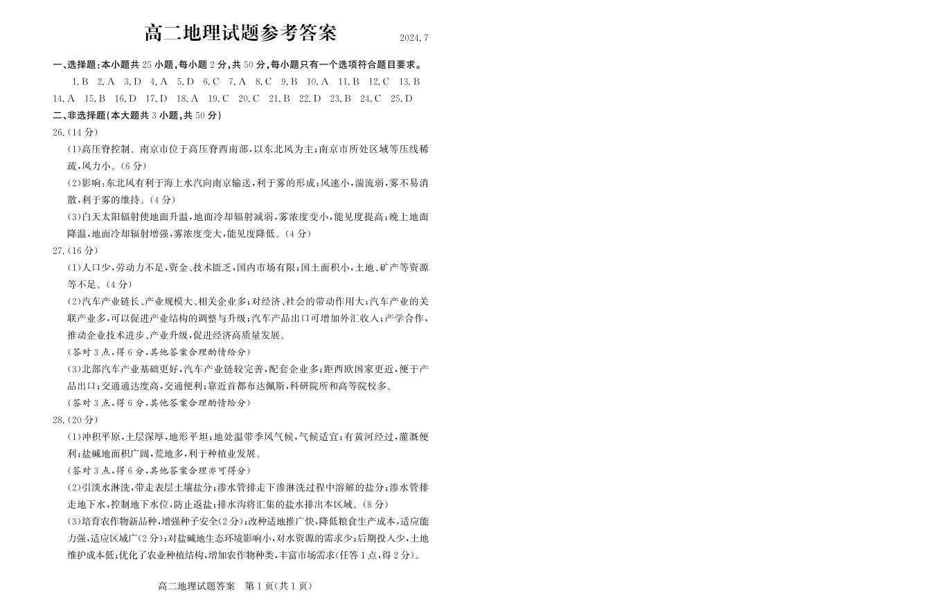 山东省滨州市2023-2024学年高二下学期期末考试 地理答案
