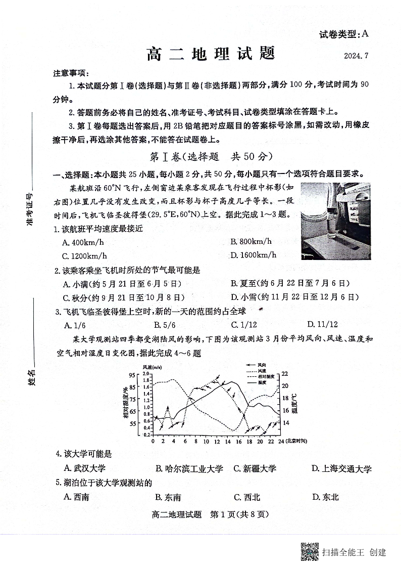 山东省滨州市2023-2024学年高二下学期期末考试 地理