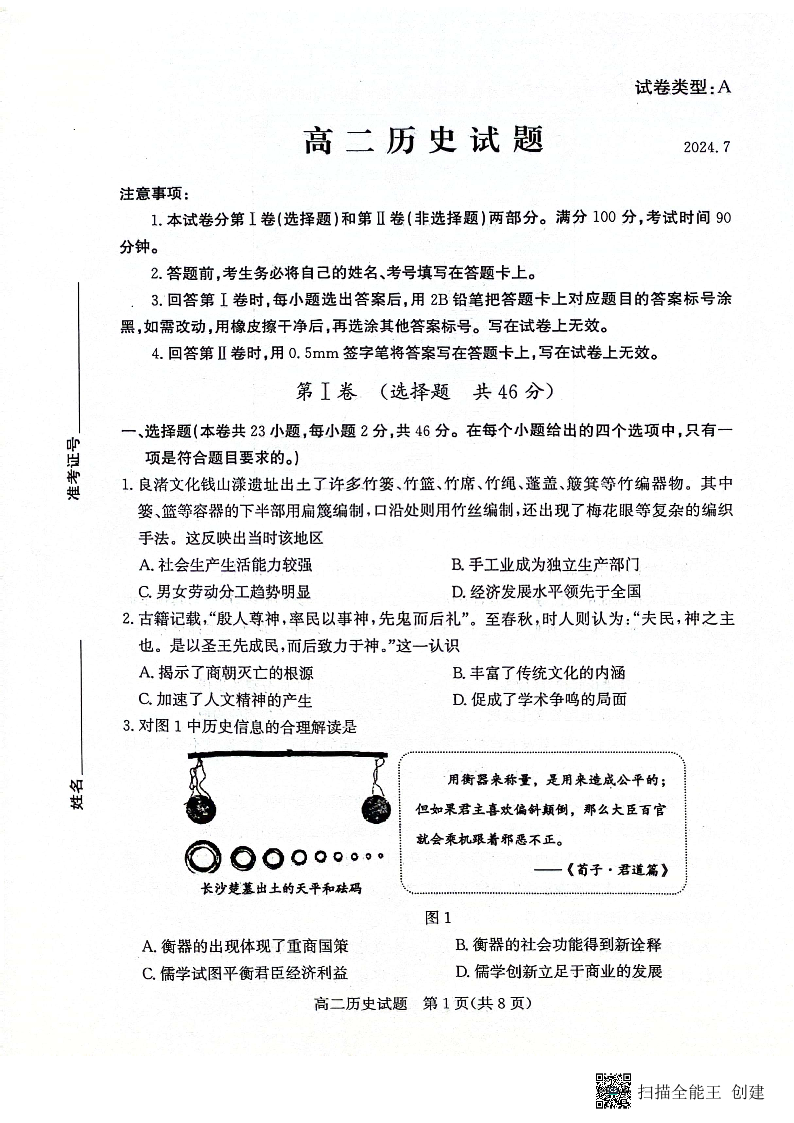 山东省滨州市2023-2024学年高二下学期期末考试 历史