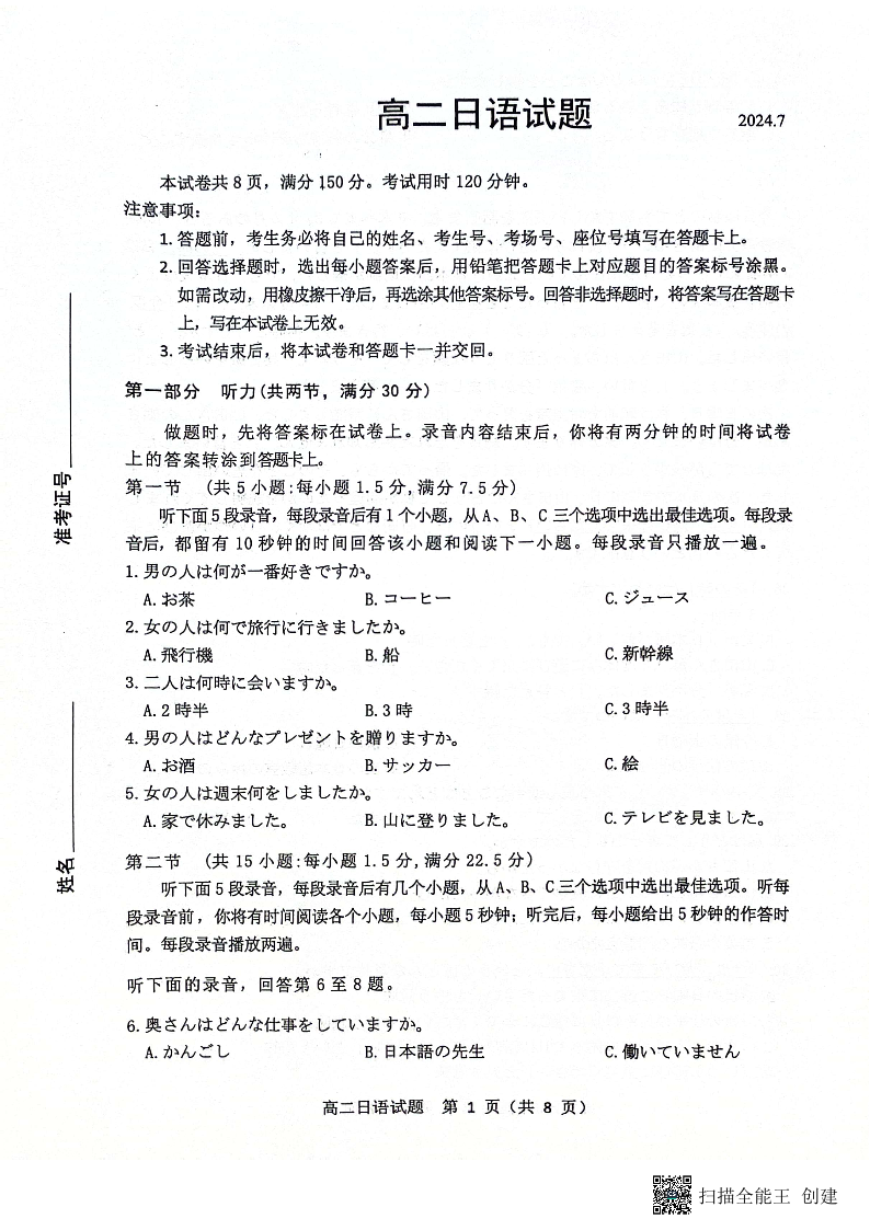山东省滨州市2023-2024学年高二下学期期末考试 日语
