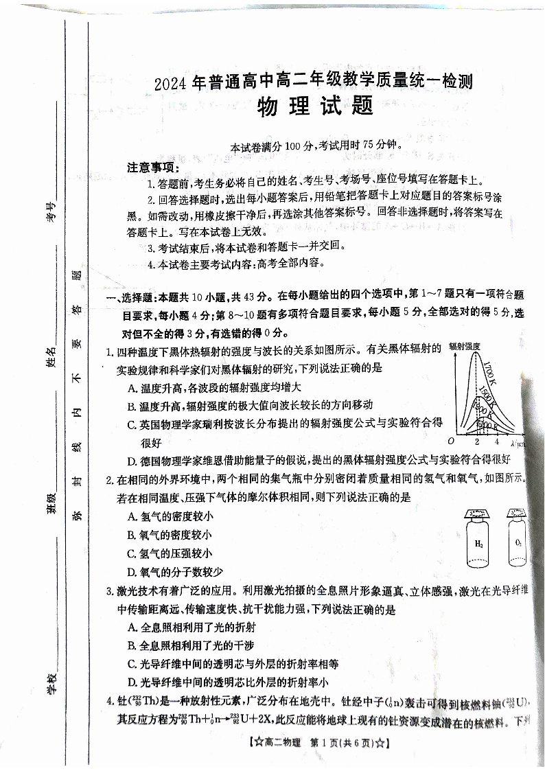 甘肃省普通高中2023-2024学年高二下学期期末教学质量统一检测 物理