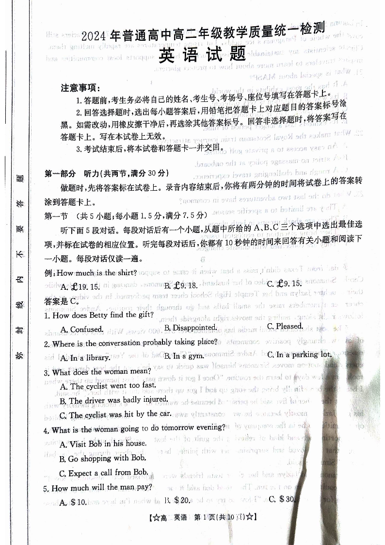 甘肃省普通高中2023-2024学年高二下学期期末教学质量统一检测 英语