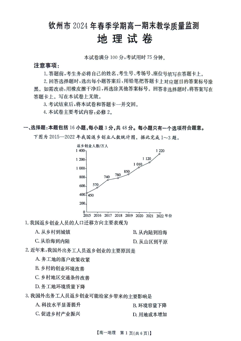 钦州市2024年春季学期高一期末教学质量监测 地理