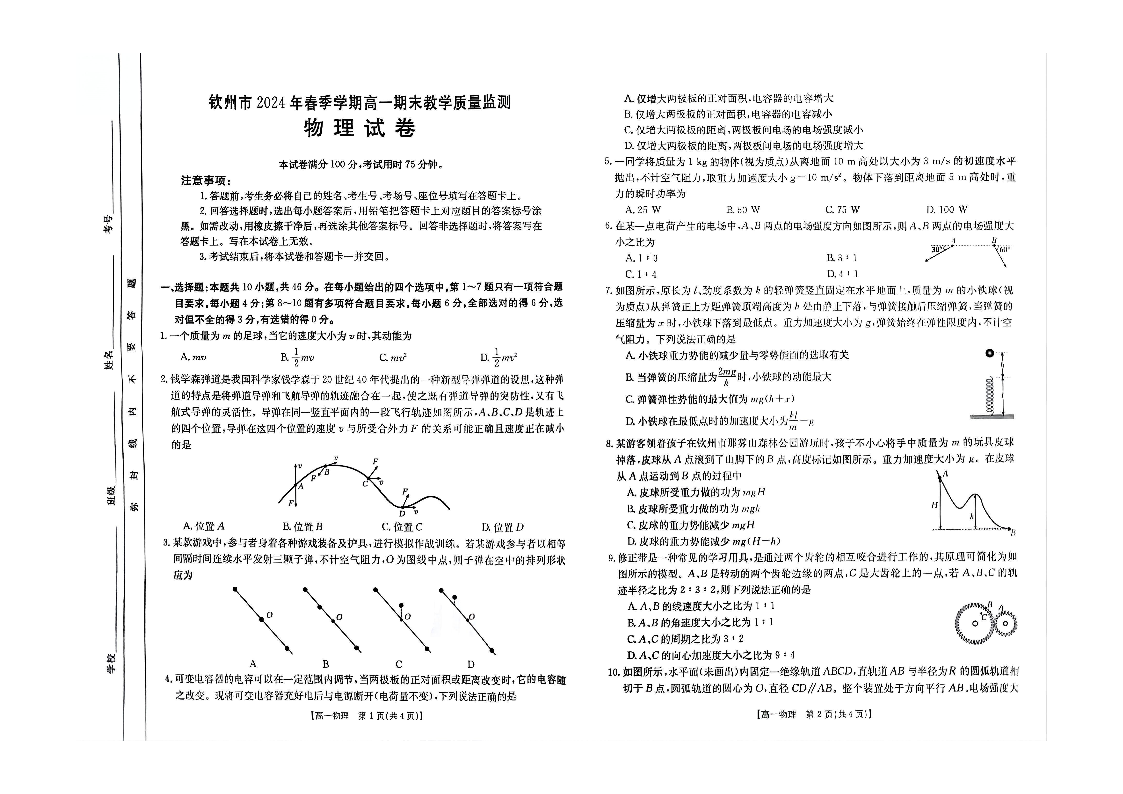 钦州市2024年春季学期高一期末教学质量监测 物理