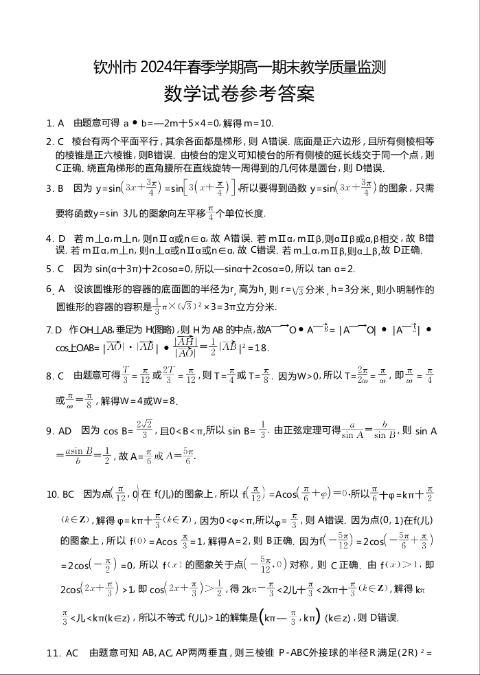 钦州市2024年春季学期高一期末教学质量监测 数学答案