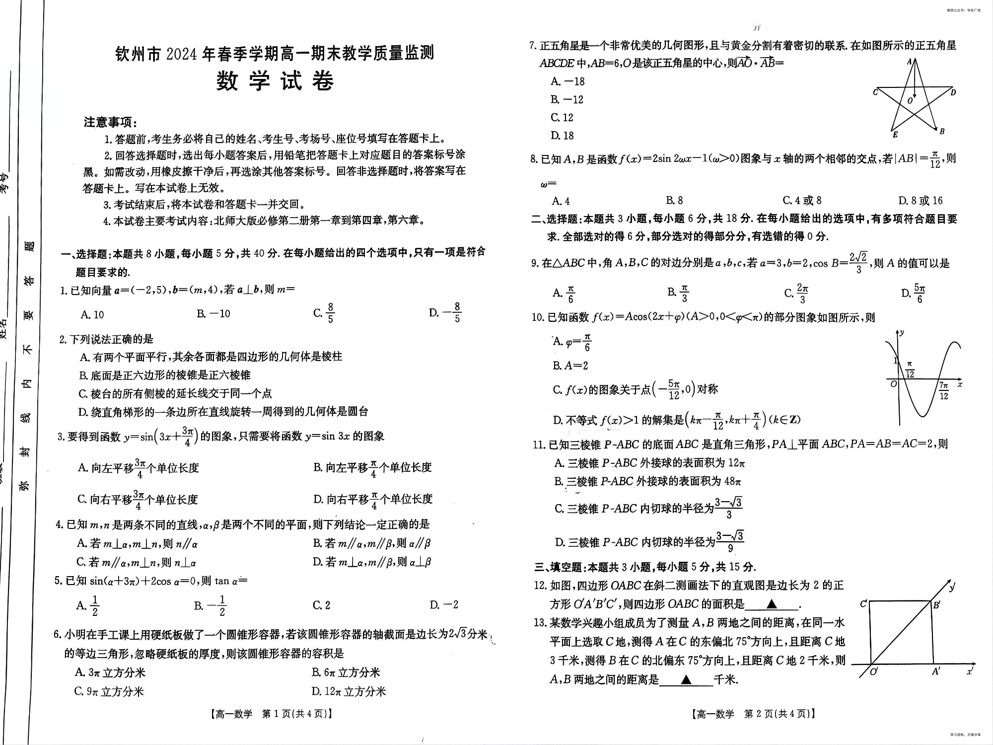 钦州市2024年春季学期高一期末教学质量监测 数学