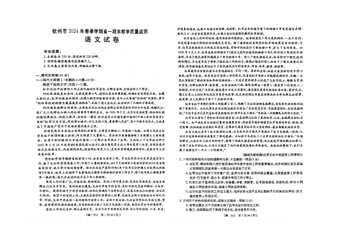 钦州市2024年春季学期高一期末教学质量监测 语文