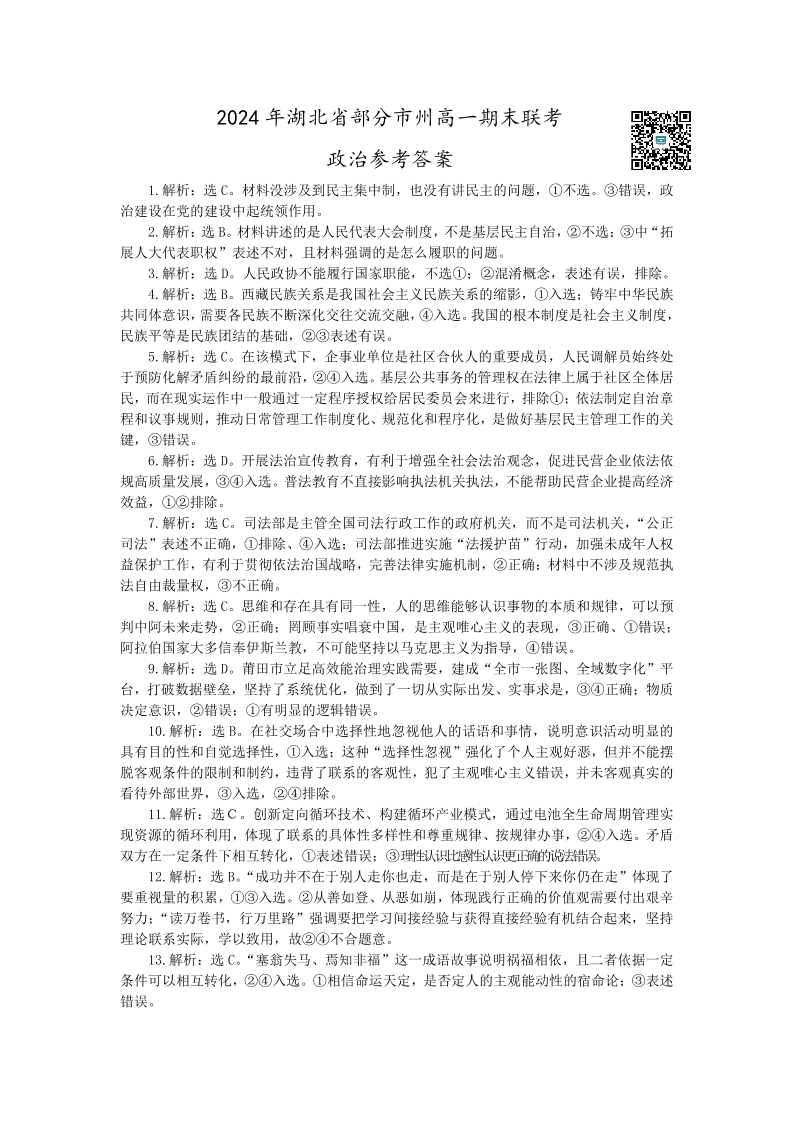 2024年湖北省五市州高一期末联考 政治参考答案
