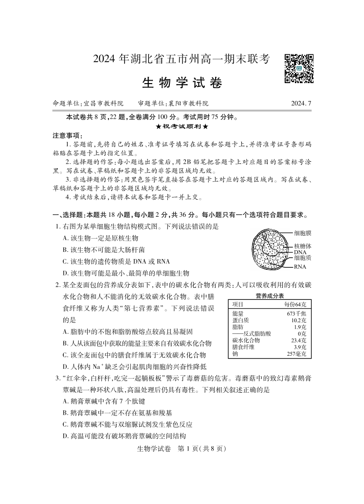 2024年湖北省五市州高一期末联考 生物