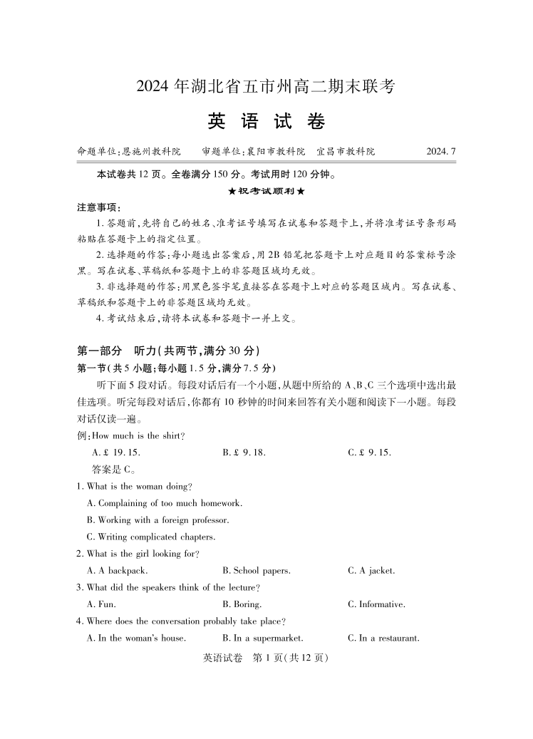 2024年湖北省五市州高二期末联考 英语