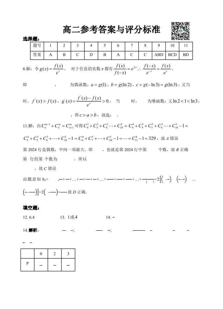 2024年湖北省五市州高二期末联考 数学参考答案