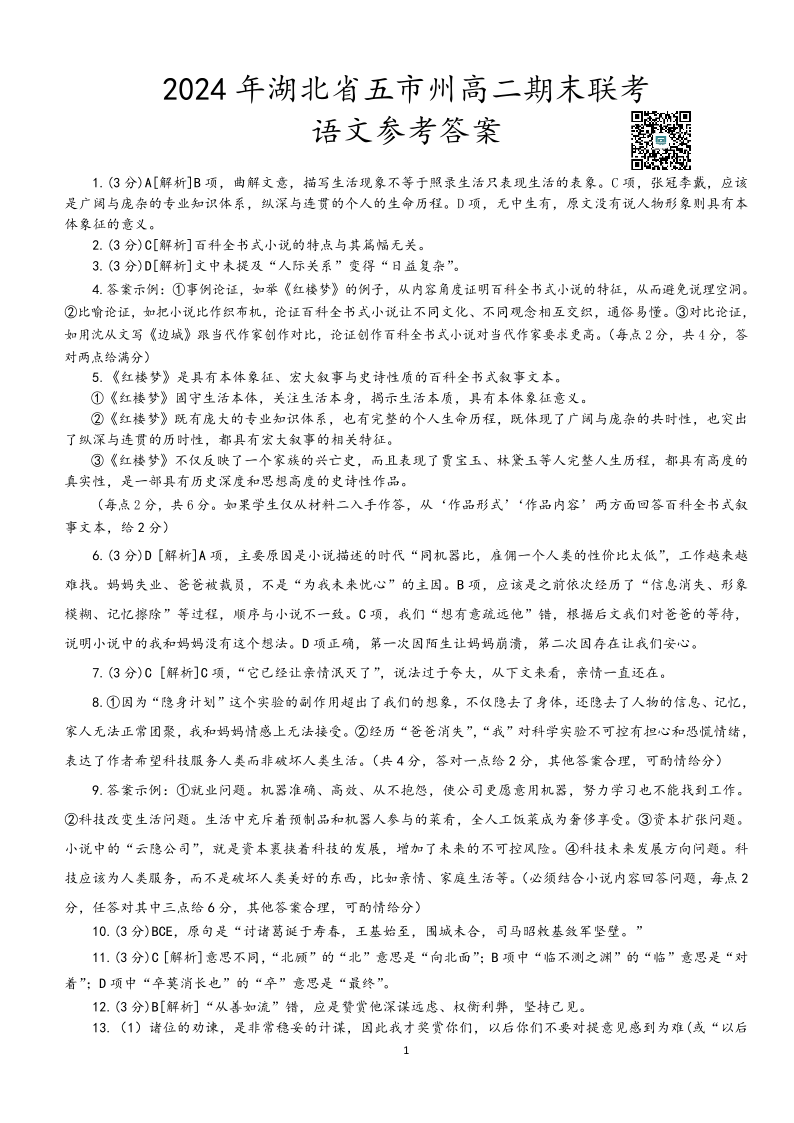 2024年湖北省五市州高二期末联考 语文参考答案