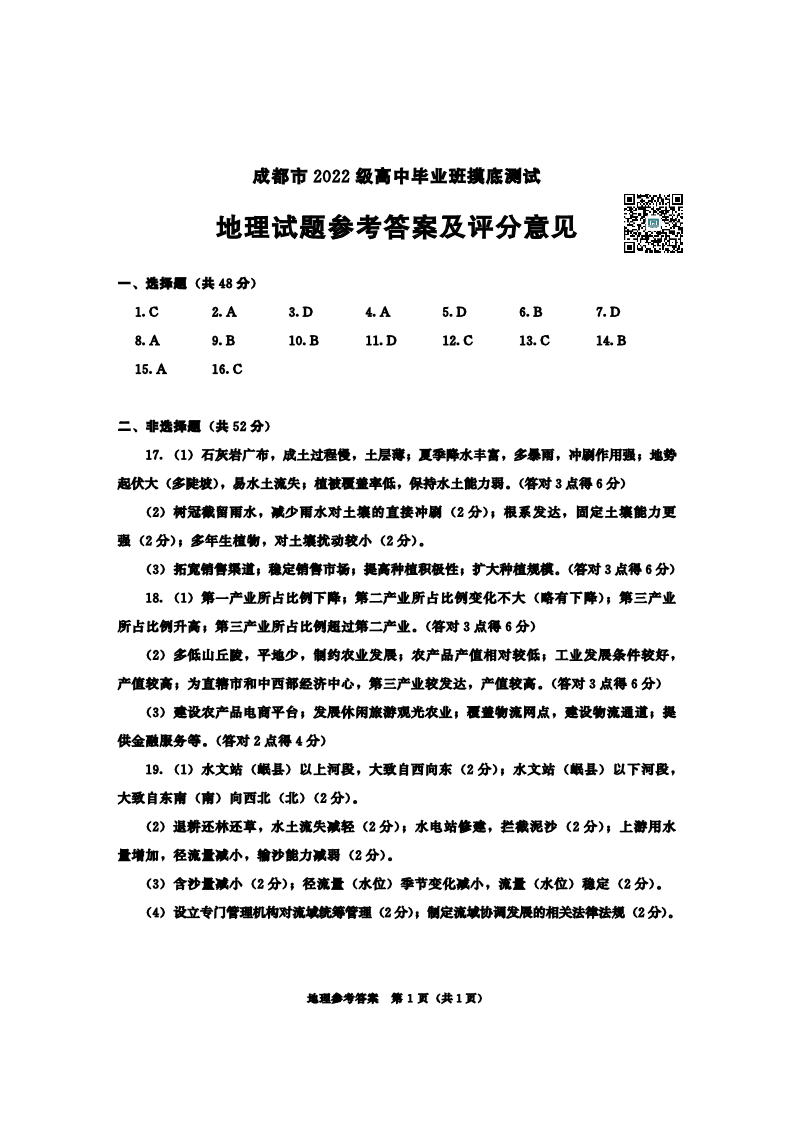 成都市2025届高三上学期毕业班摸底测试(零诊)地理答案