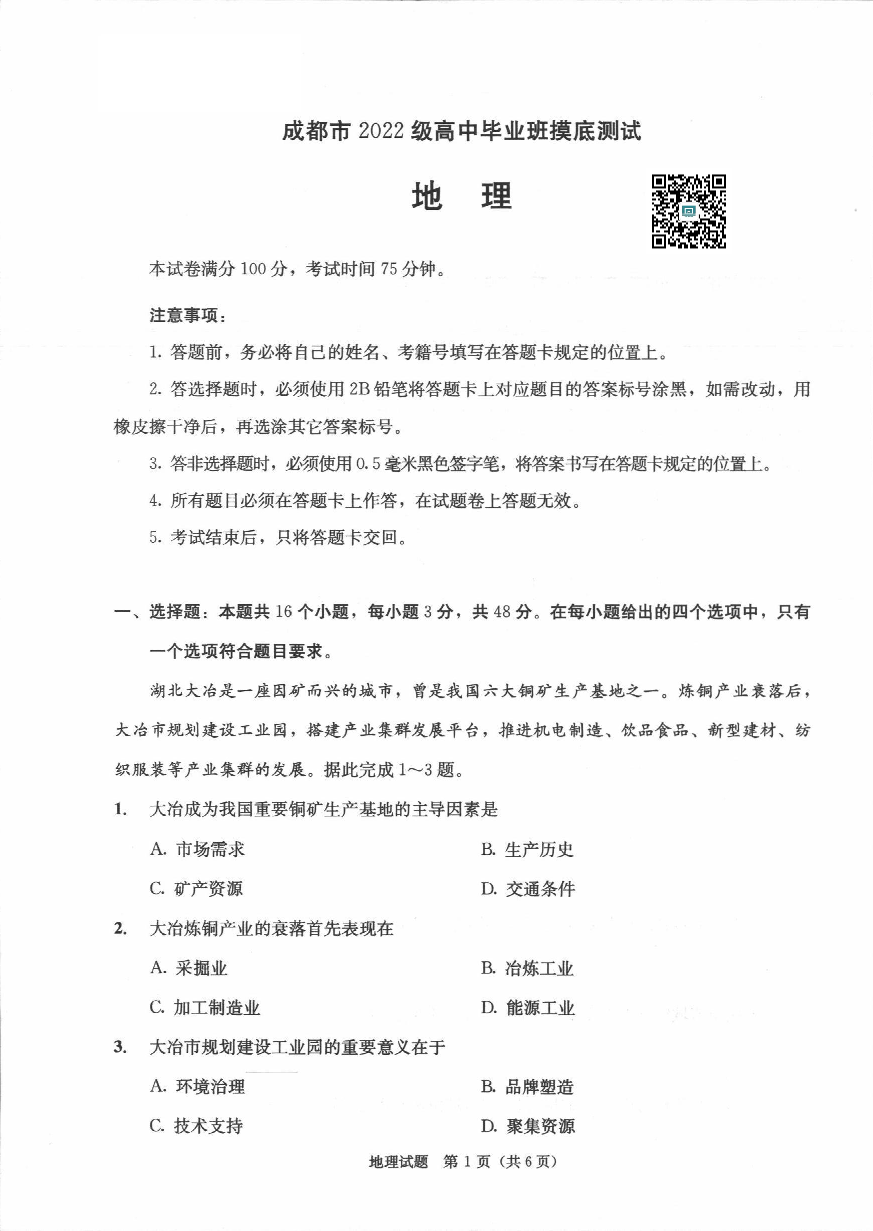 成都市2025届高三上学期毕业班摸底测试(零诊)地理
