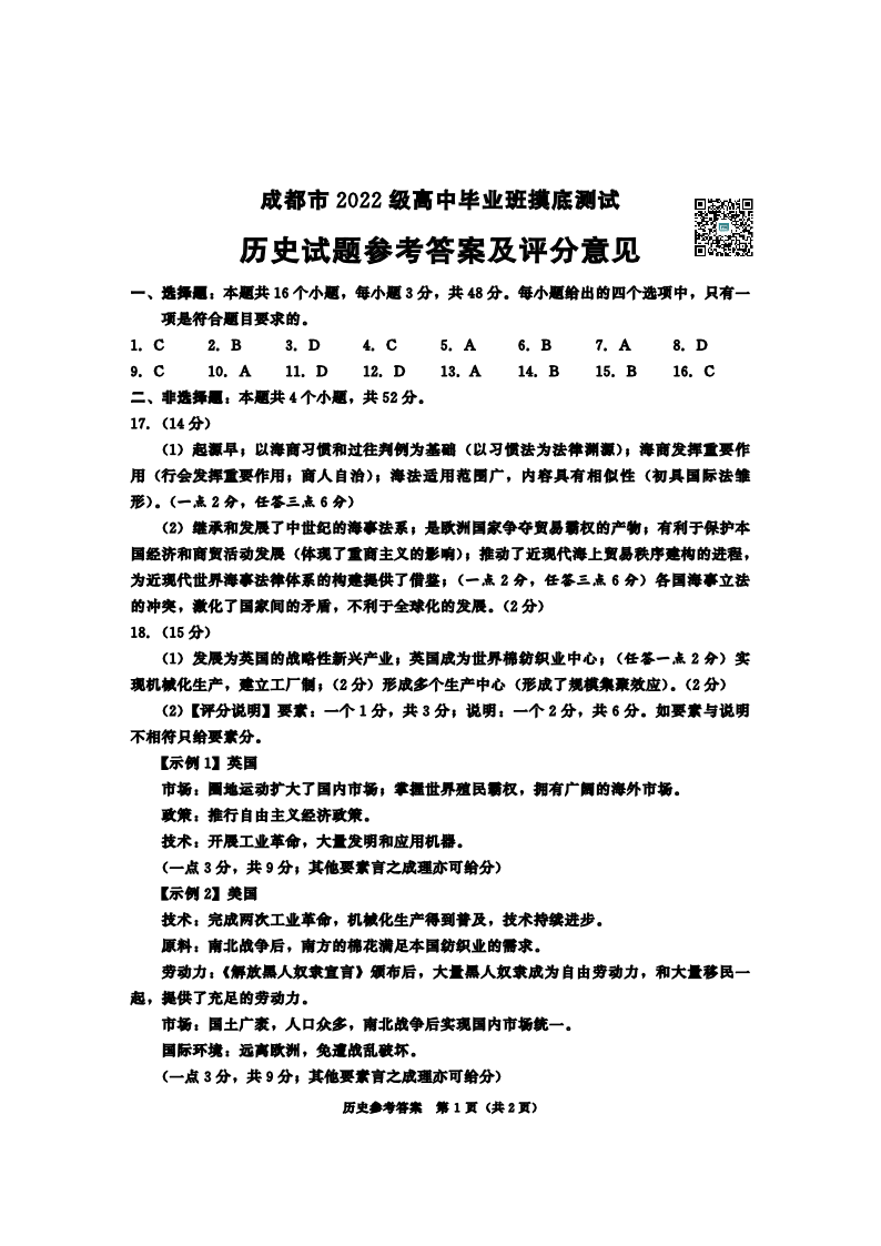 成都市2025届高三上学期毕业班摸底测试(零诊)历史答案