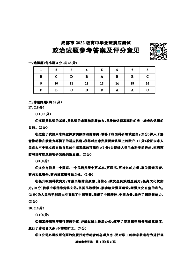 成都市2025届高三上学期毕业班摸底测试(零诊)政治答案