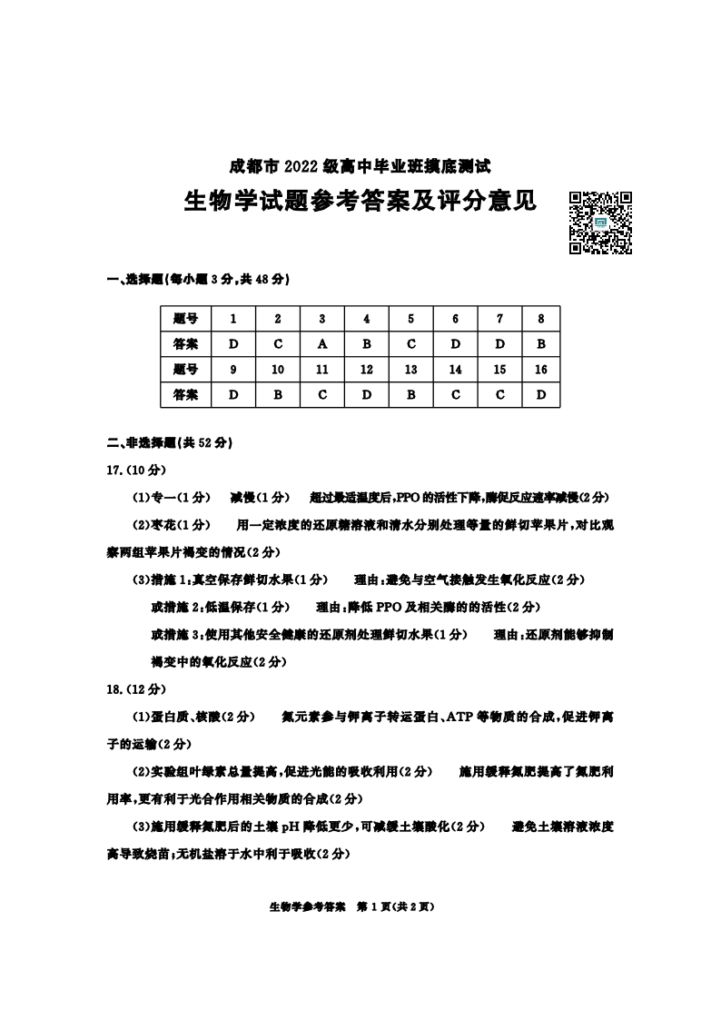 成都市2025届高三上学期毕业班摸底测试(零诊)生物答案