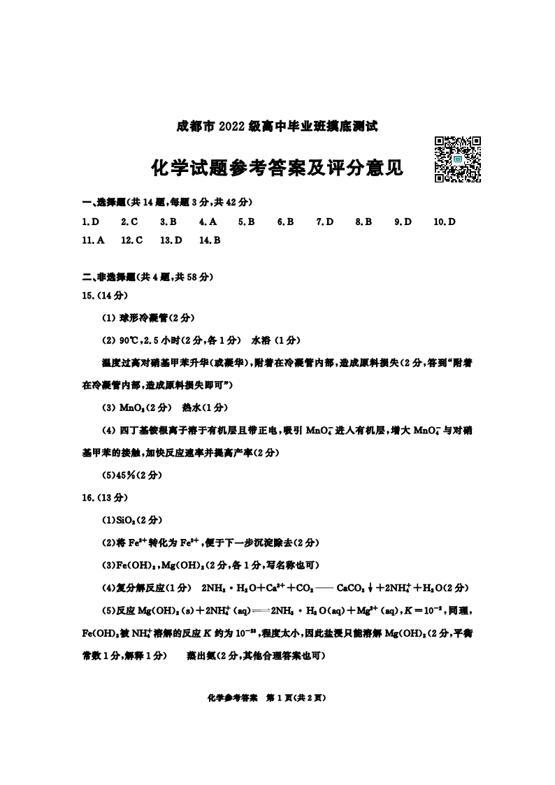 成都市2025届高三上学期毕业班摸底测试(零诊)化学答案
