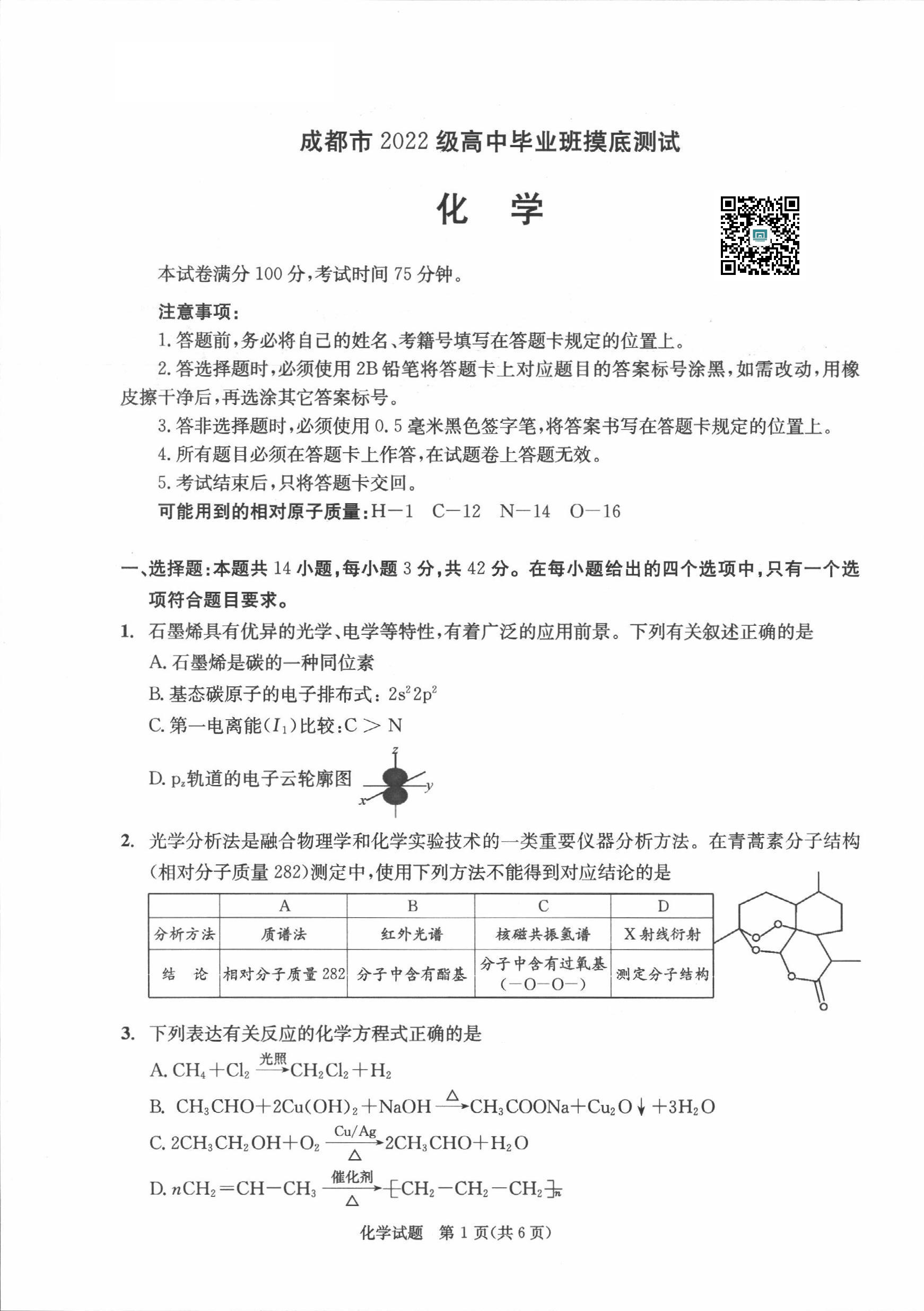 成都市2025届高三上学期毕业班摸底测试(零诊)化学