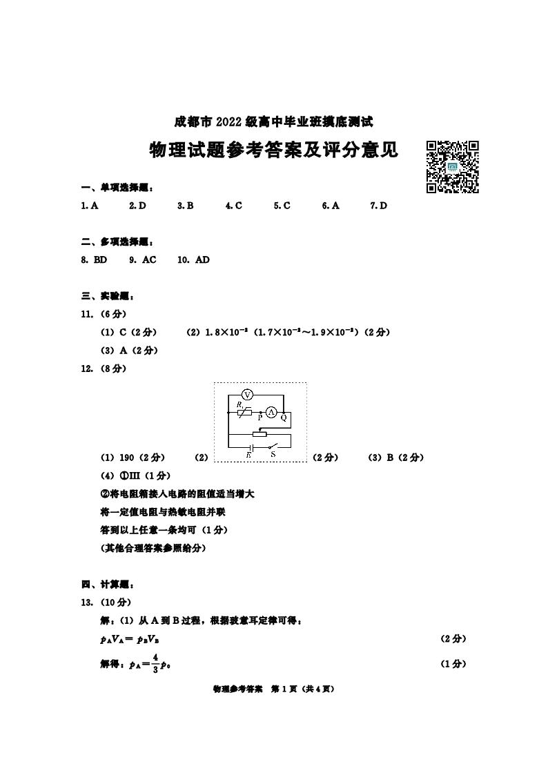 成都市2025届高三上学期毕业班摸底测试(零诊)物理答案