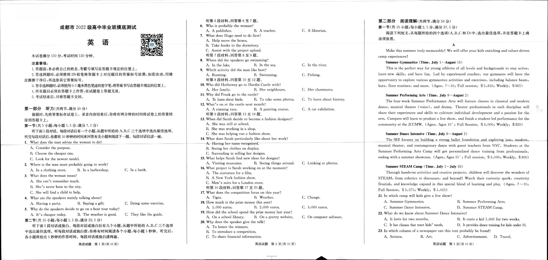 成都市2025届高三上学期毕业班摸底测试(零诊)英语