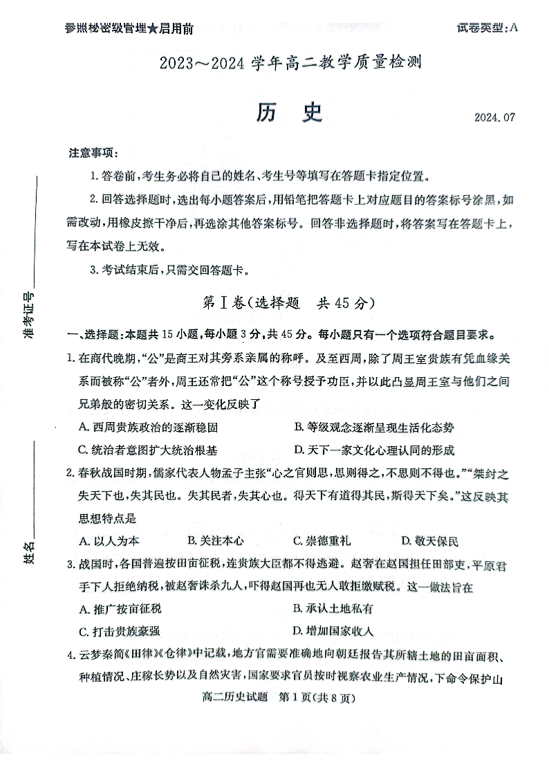 山东省枣庄市2023~2024学年高二教学质量检测 历史