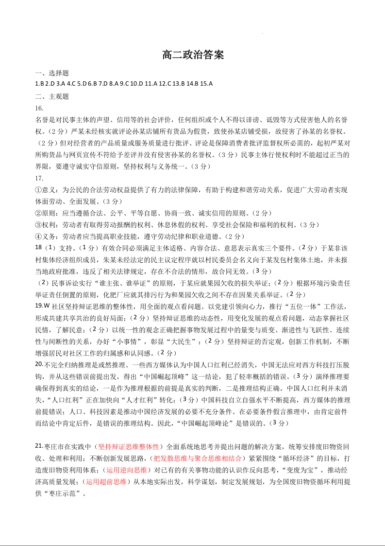 山东省枣庄市2023~2024学年高二教学质量检测 政治答案