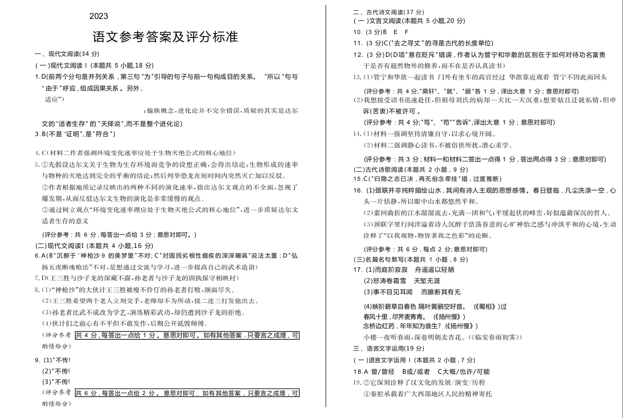 山东省枣庄市2023~2024学年高二教学质量检测 语文答案