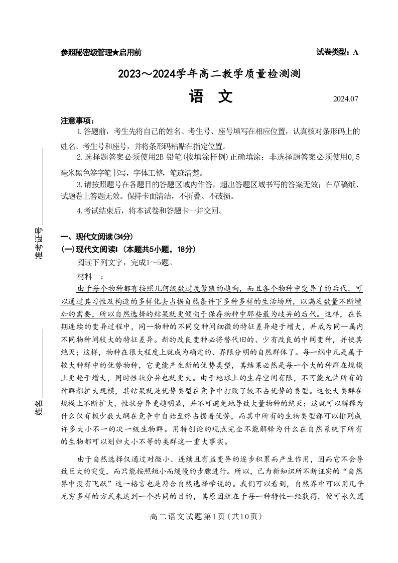 山东省枣庄市2023~2024学年高二教学质量检测 语文
