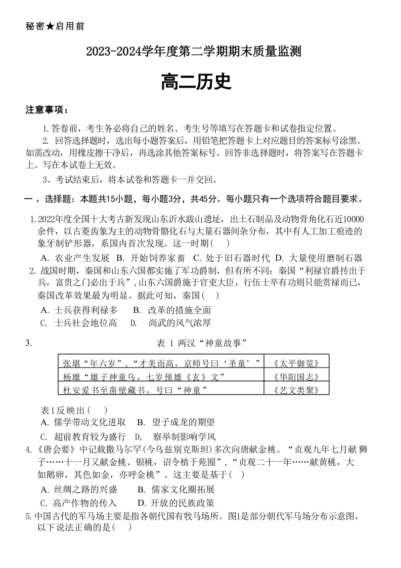 山东省东营市2023-2024学年度第二学期期末质量监测 历史