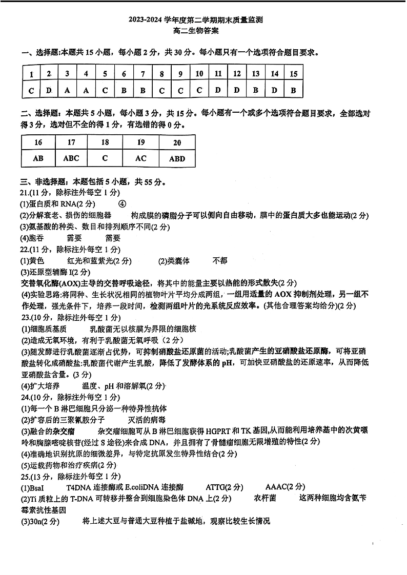 山东省东营市2023-2024学年度第二学期期末质量监测 生物答案